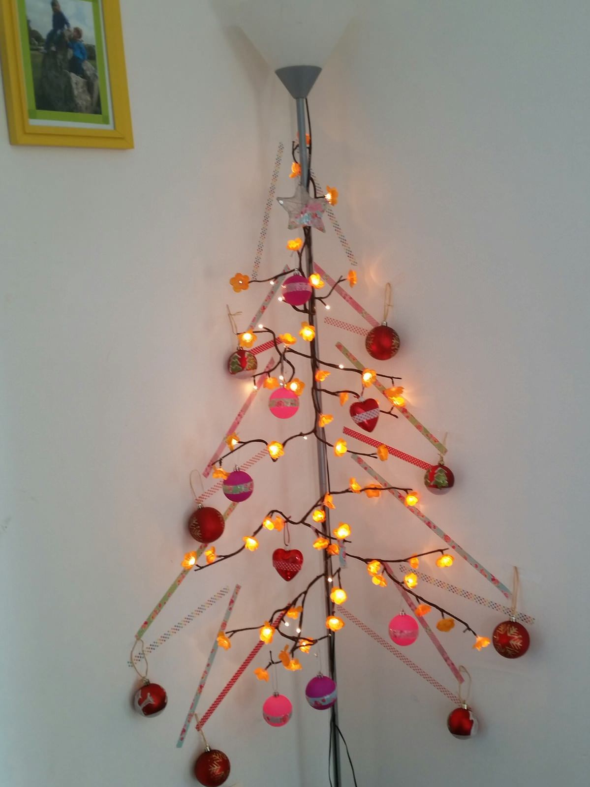 Her har man været kreativ og udnyttet en standerlampe i hjørnet af en stue til at lave et hjemmelavet juletræ bestående af tape, julelys og julekugler.