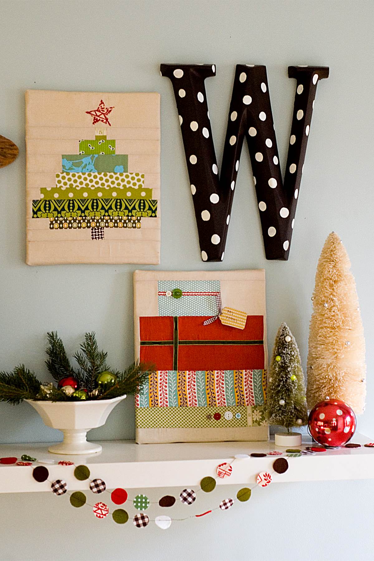 Der er mange muligheder for at få juletræet ind i hjemmet på andre måder end med et ægte grantræ. Små, fine kanvasbilleder kan også dekorere væggene december igennem. Det er ligeledes et DIY-projekt, der er overskueligt at kaste sig over, da du nemt kan lave små kollager af fint tapet som på billedet eller bruge farverigt tape til at skabe små grantræer.