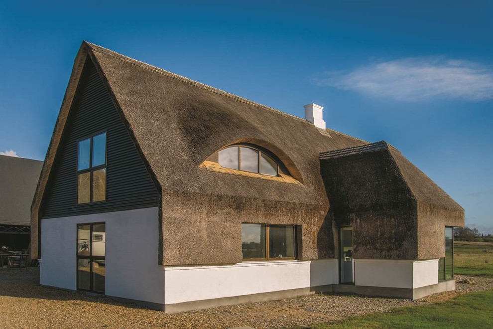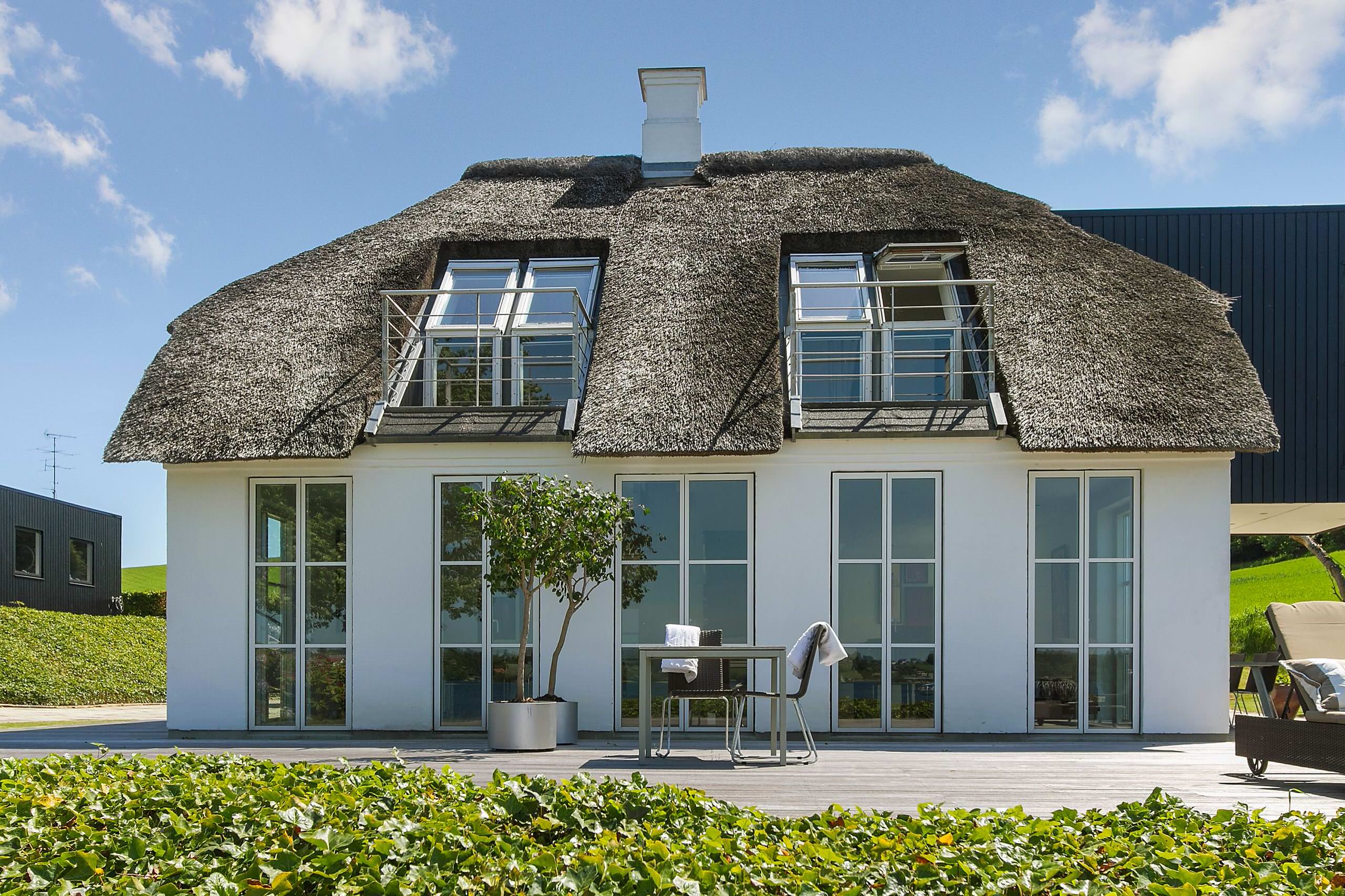 4. Måske forbinder du stråtag med gamle sommerhuse, men strå på taget kan også skabe smuk kontrast til moderne huse. Her spiller materialer som glas, stål og hvide facader godt sammen med det landlige stråtag på et hus ved Odense.