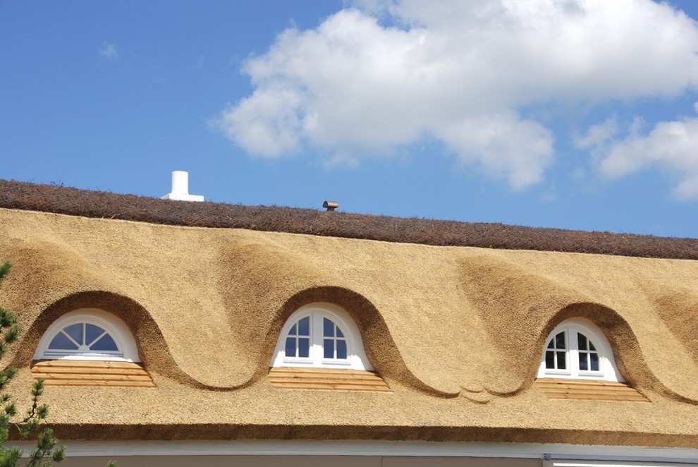 17. Tækkemanden har arbejdet med fine organiske former og detaljer på dette stråtag, der fremhæver de buende tagvinduer.
