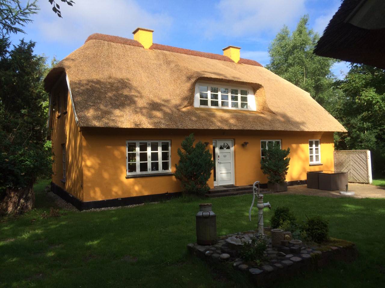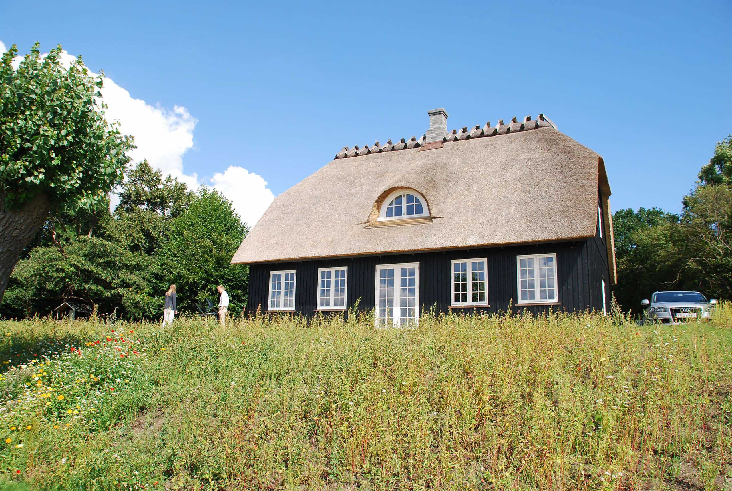 21. Husets røde mursten og det lyse stråtag passer smukt ind i de vilde naturomgivelser i sommerhusområdet her.