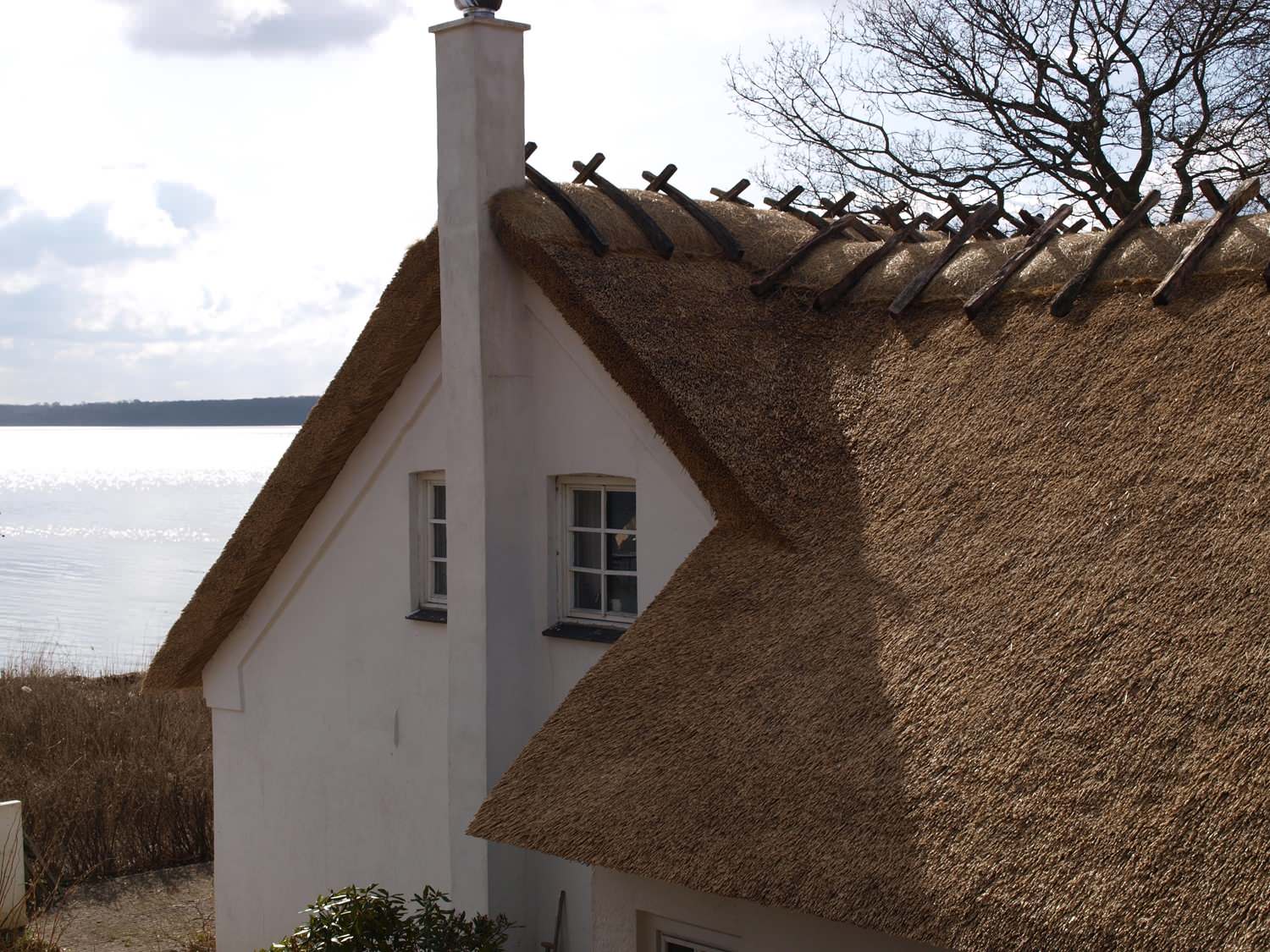 8. Et flot stråtækt hus med en smuk belligenhed lige ned til vandet.