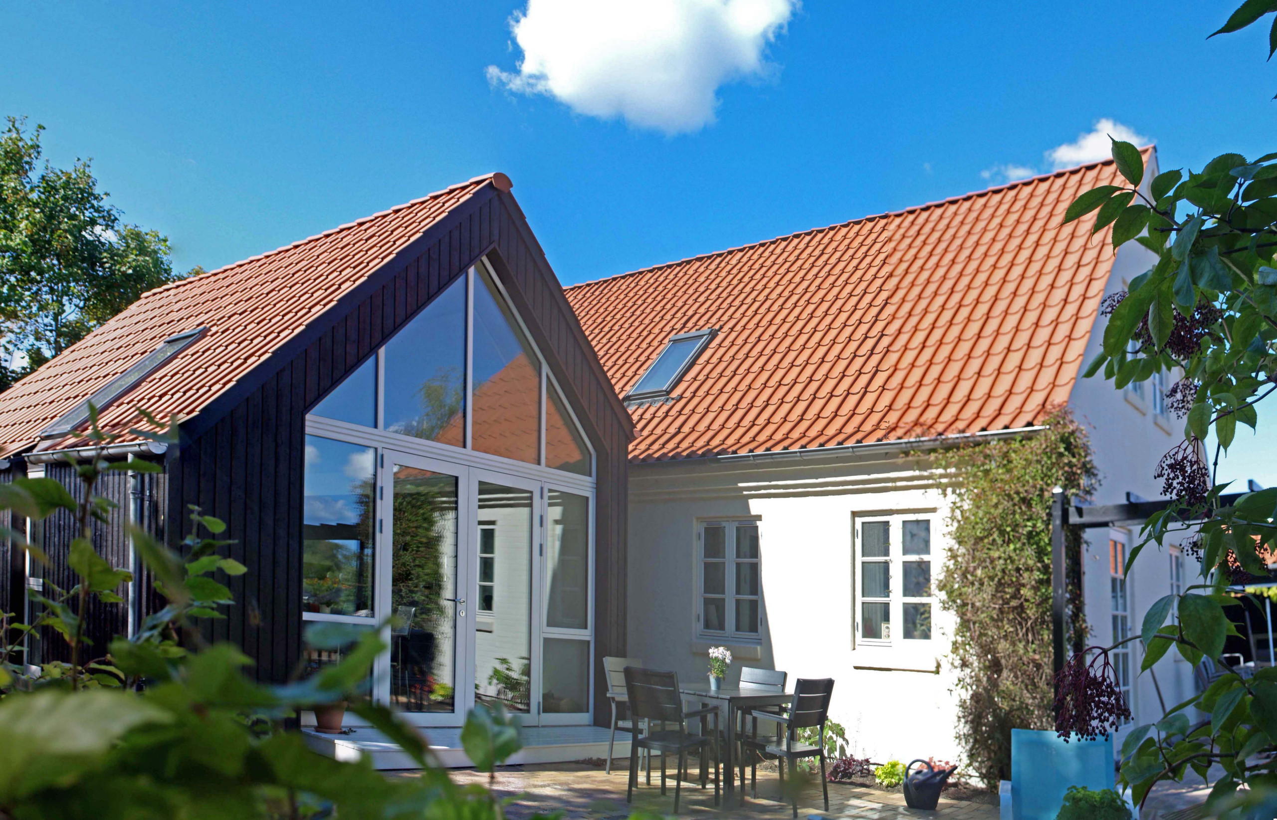 13. Det hvidpudsede murstenshus og den nye tilbygning i sort træ skaber iøjnefaldende kontrast.