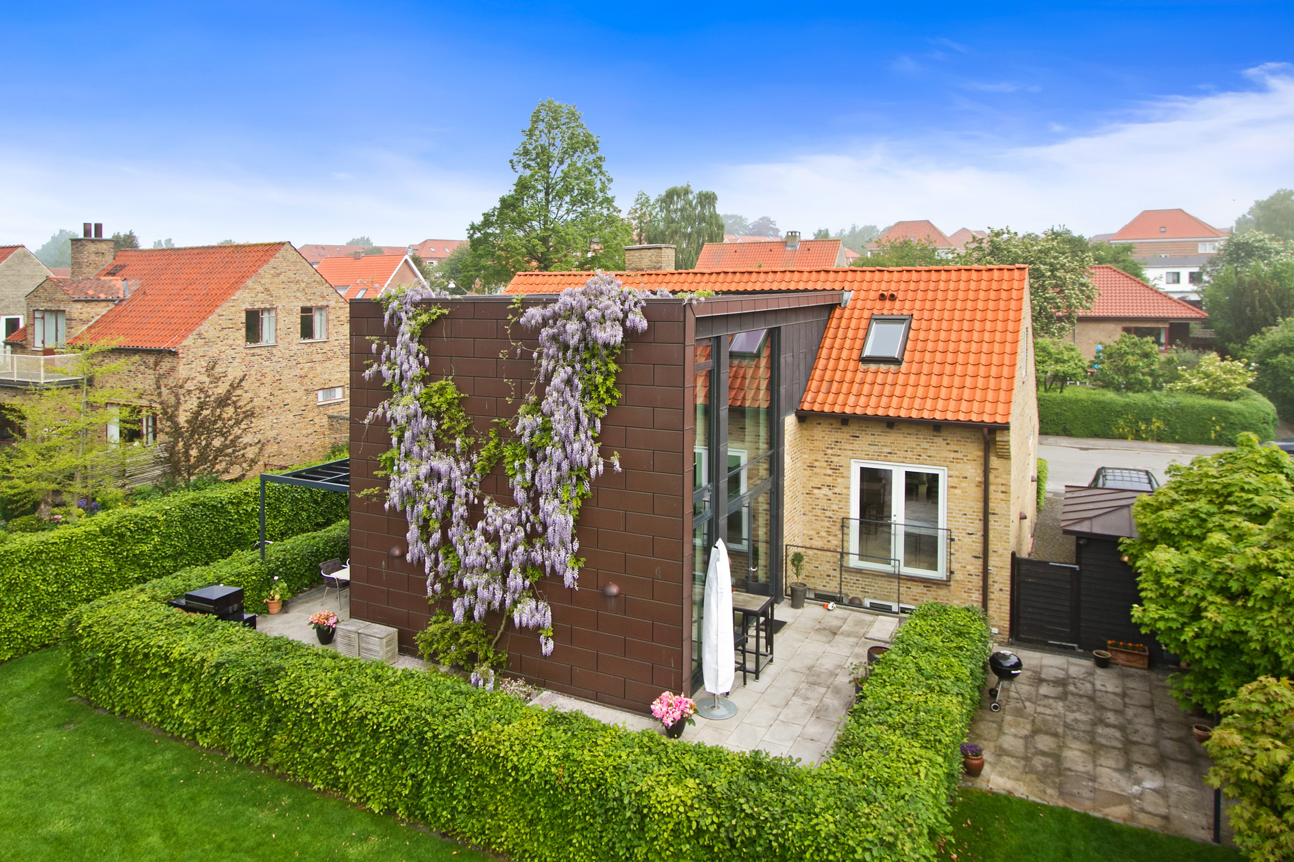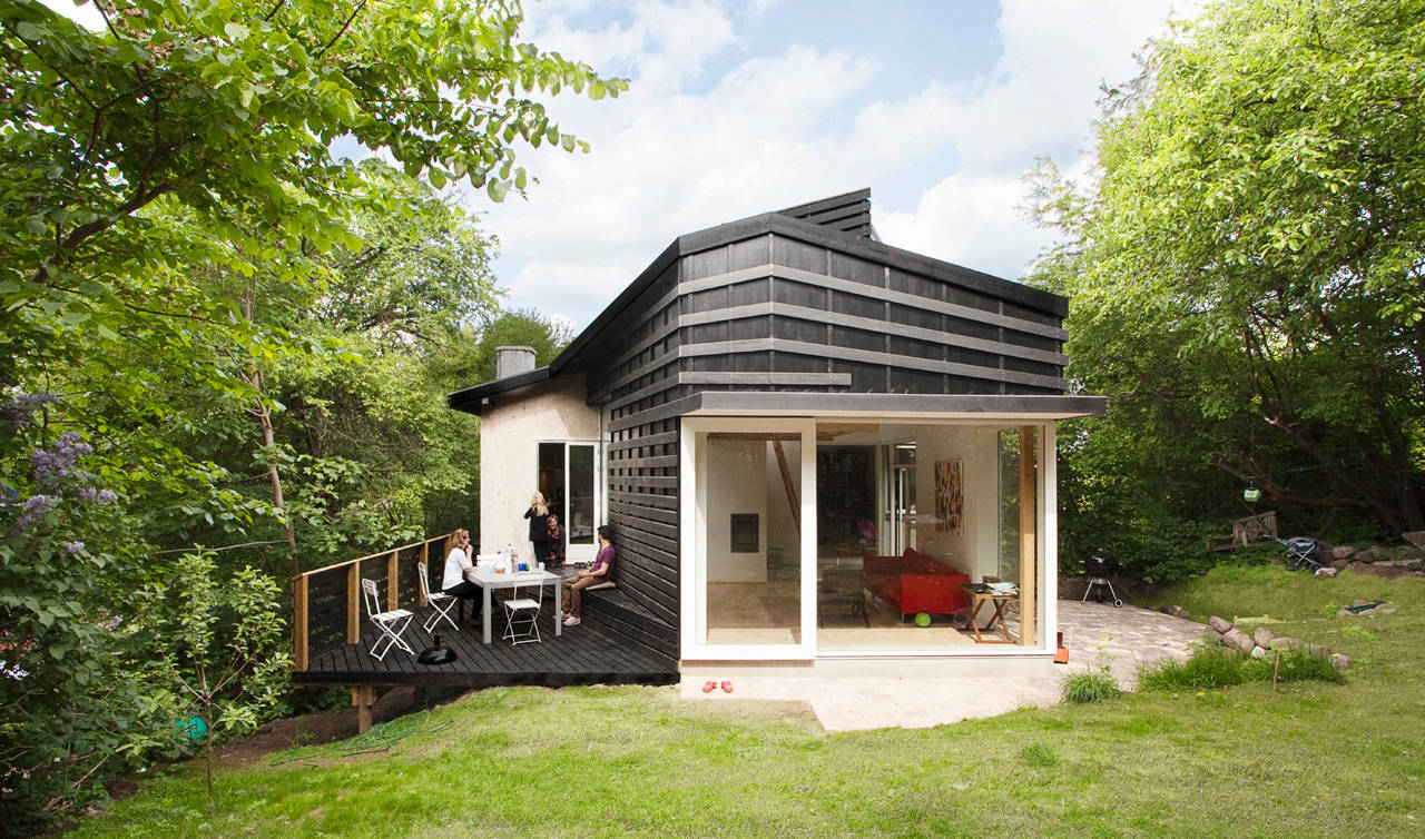 10. En helt unik tilbygning i træ og med store glasfacader. Tilbygningen udnytter grundens hældning og har et sjovt element med græs på taget.