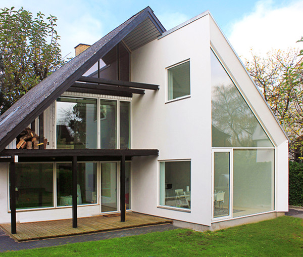 19. Huset består af to store trekantede karnapper, hvor den mest iøjnefaldende er holdt helt simpel og moderne med hvide facader og glas.