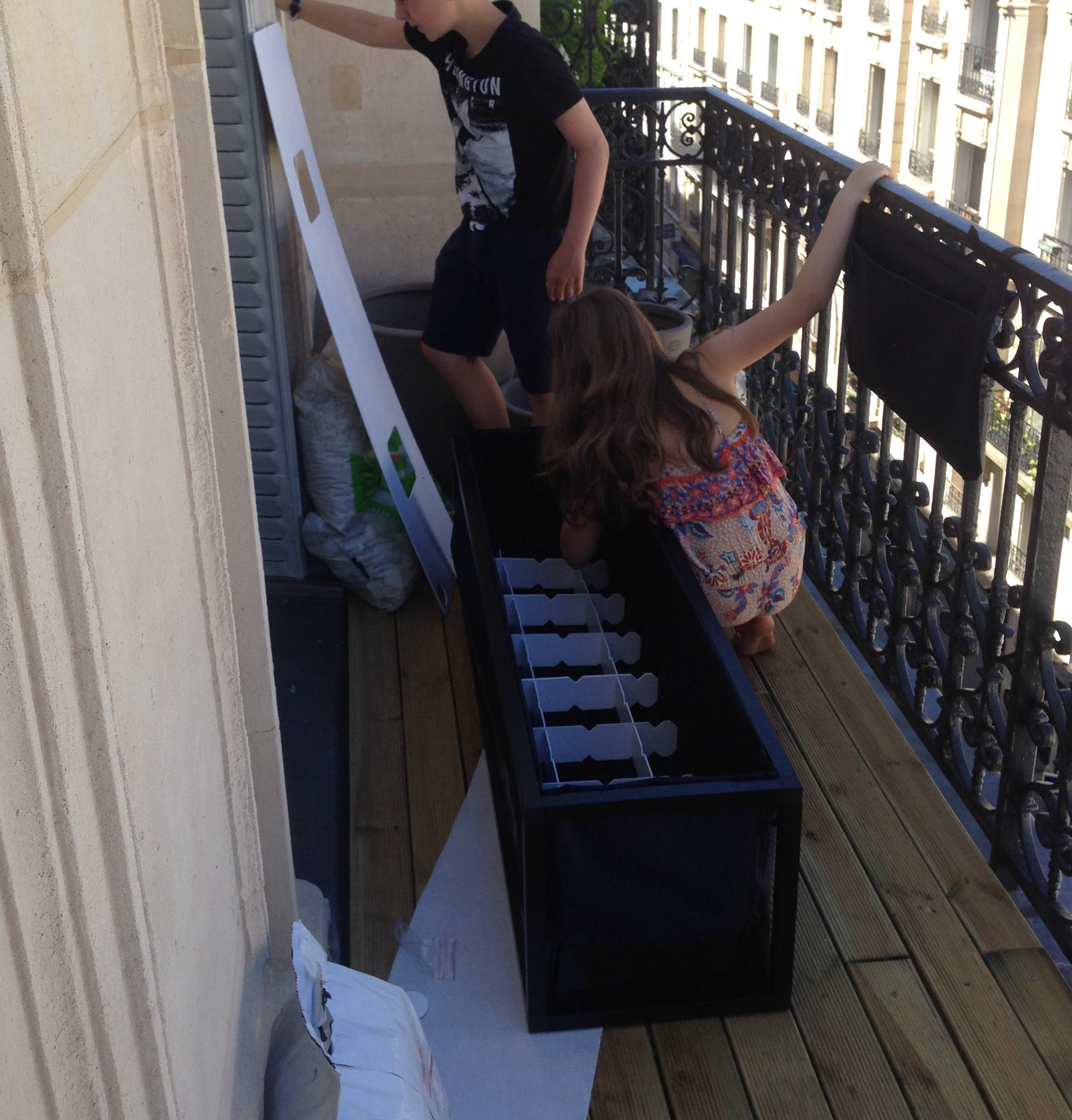 Efter. Faren spurgte Anouck til råds om materialer, og hun tog med ham ud for at købe de nødvendige forsyninger til projektet. Ud over træet til gulvet blev alle materialer og planter købt hos en planteskole i en forstad til Paris.