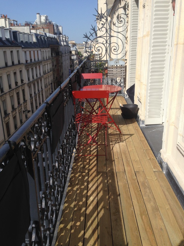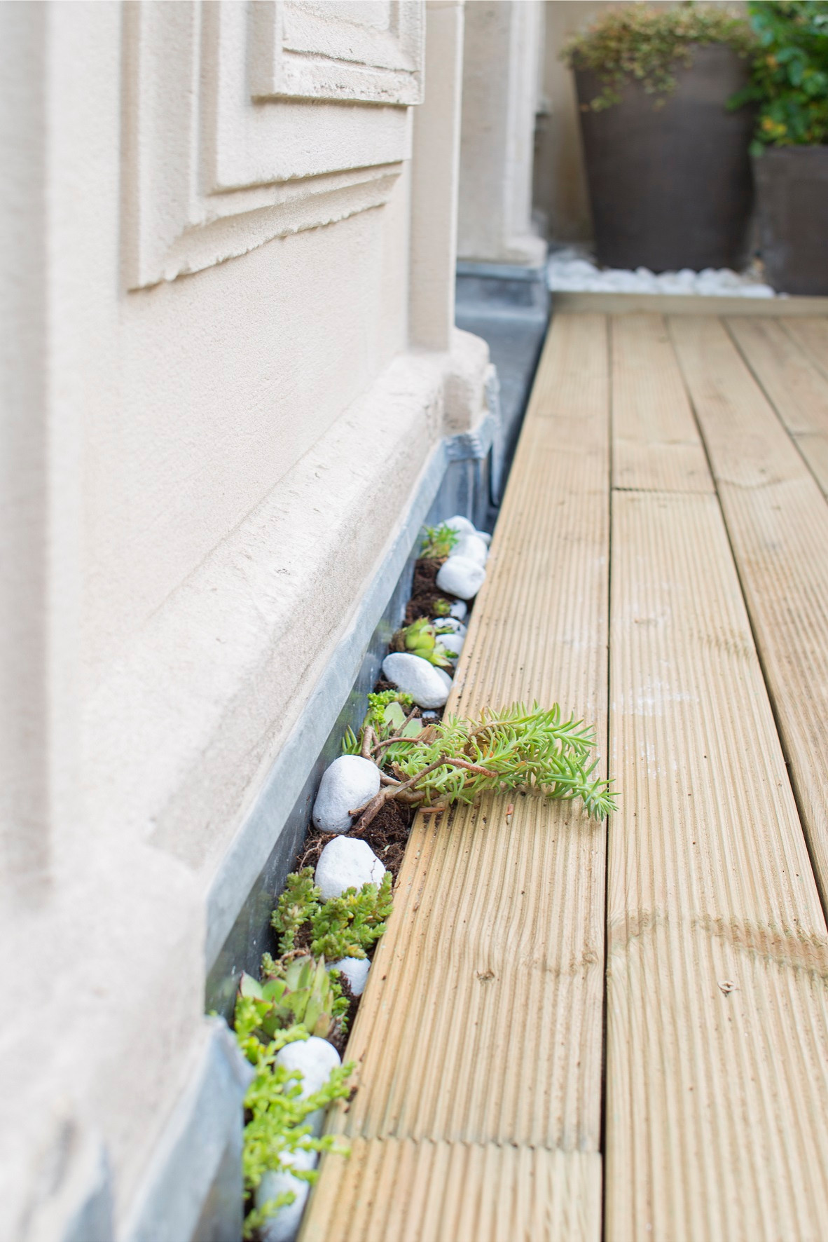 Ejeren har hænderne skruet godt på, og på kun tre aftener forvandlede han egenhændigt zinkbalkonen til en træterrasse med friske, rillede træplanker. Det var også Anoucks idé at fylde mellemrummene i siderne: