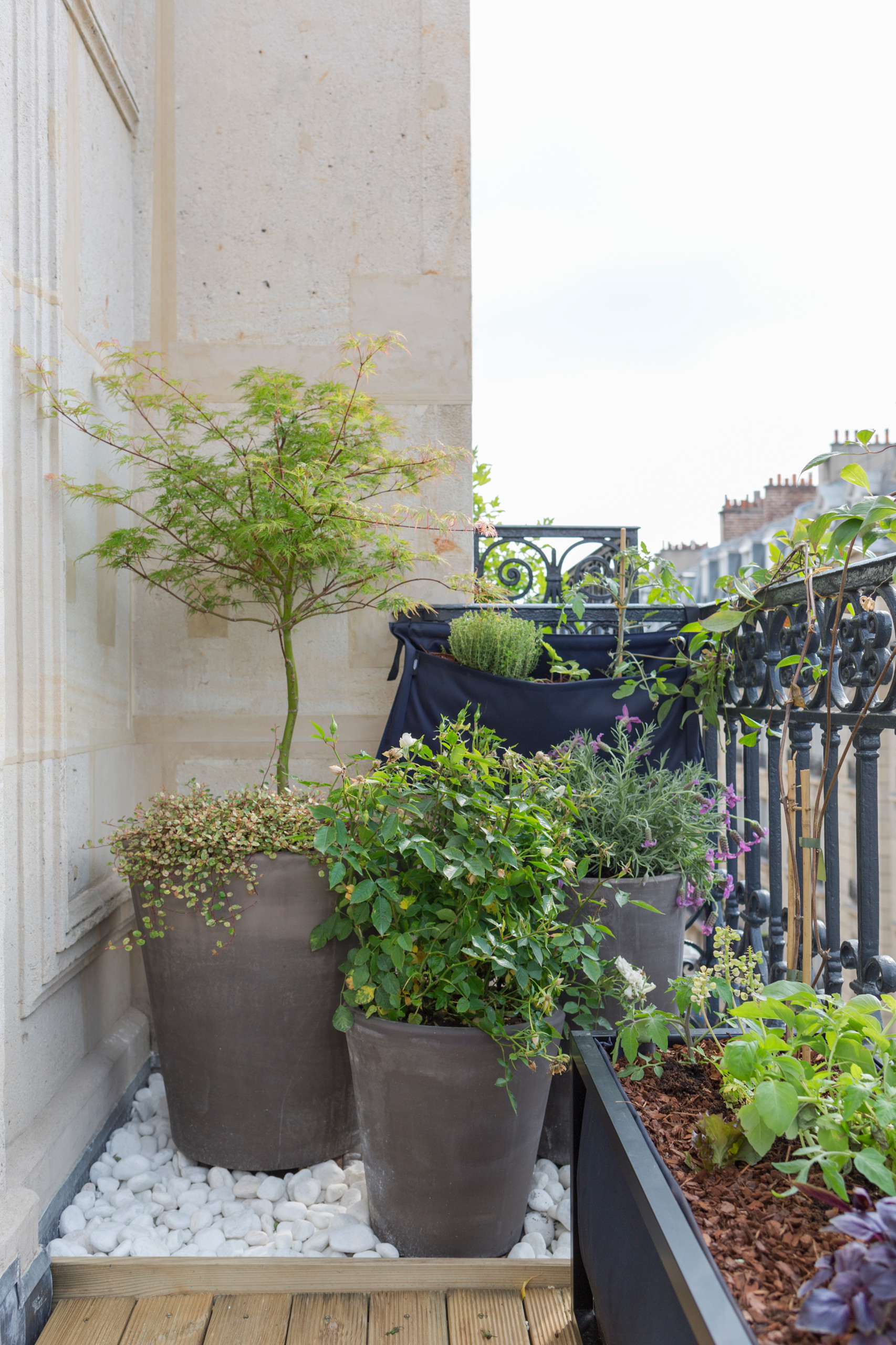 Anouck valgte med vilje potter i varierende størrelser og fyldte dem med planter i afdæmpede nuancer: viftebladet løn (Acer japonicum) til venstre, en duftende, hvid rose i midten og lavendel til højre. Bag potterne vokser urter og krydderurter i en geotekstilpose på balkonens gelænder.