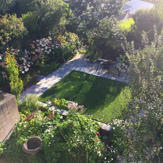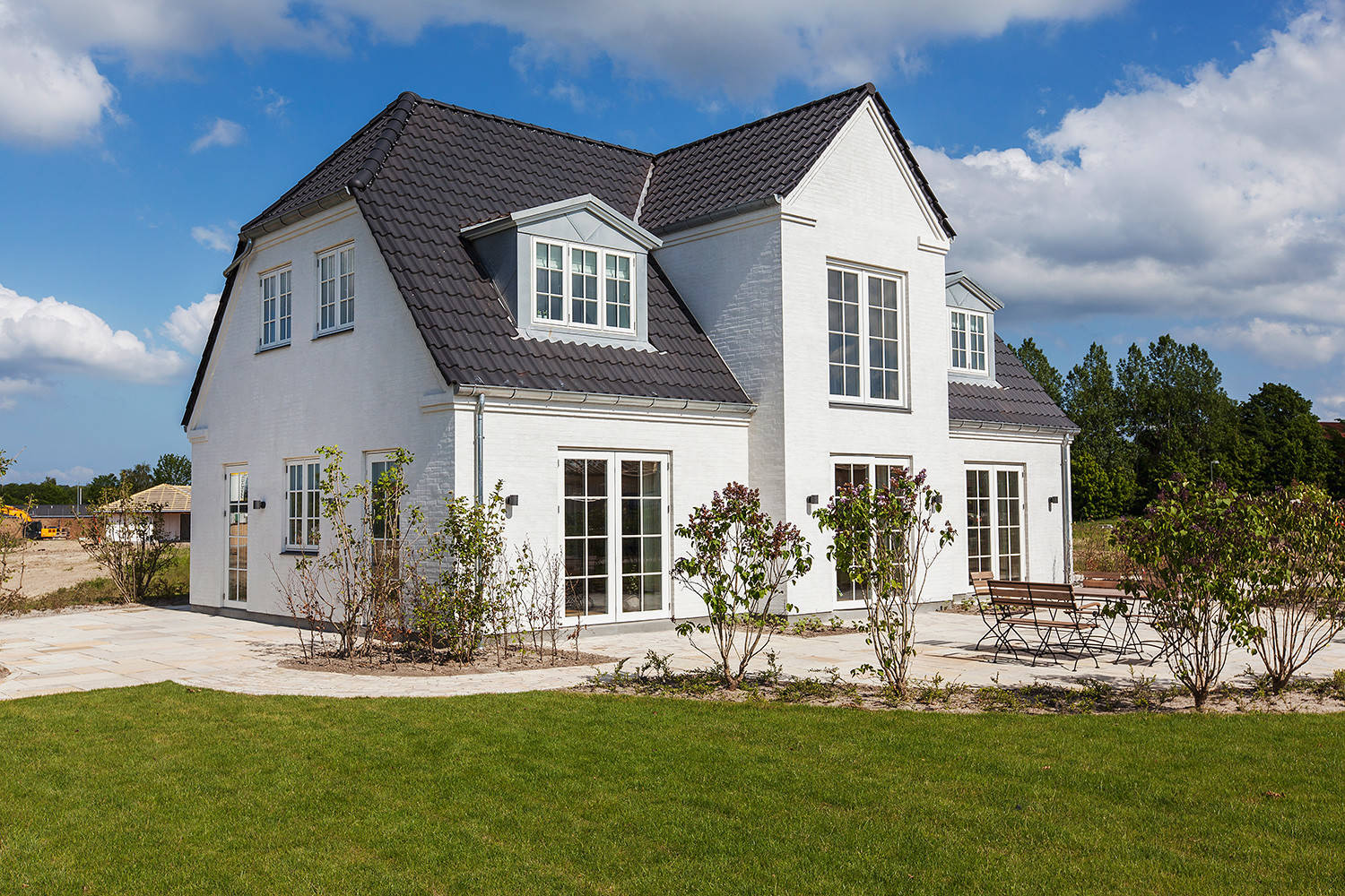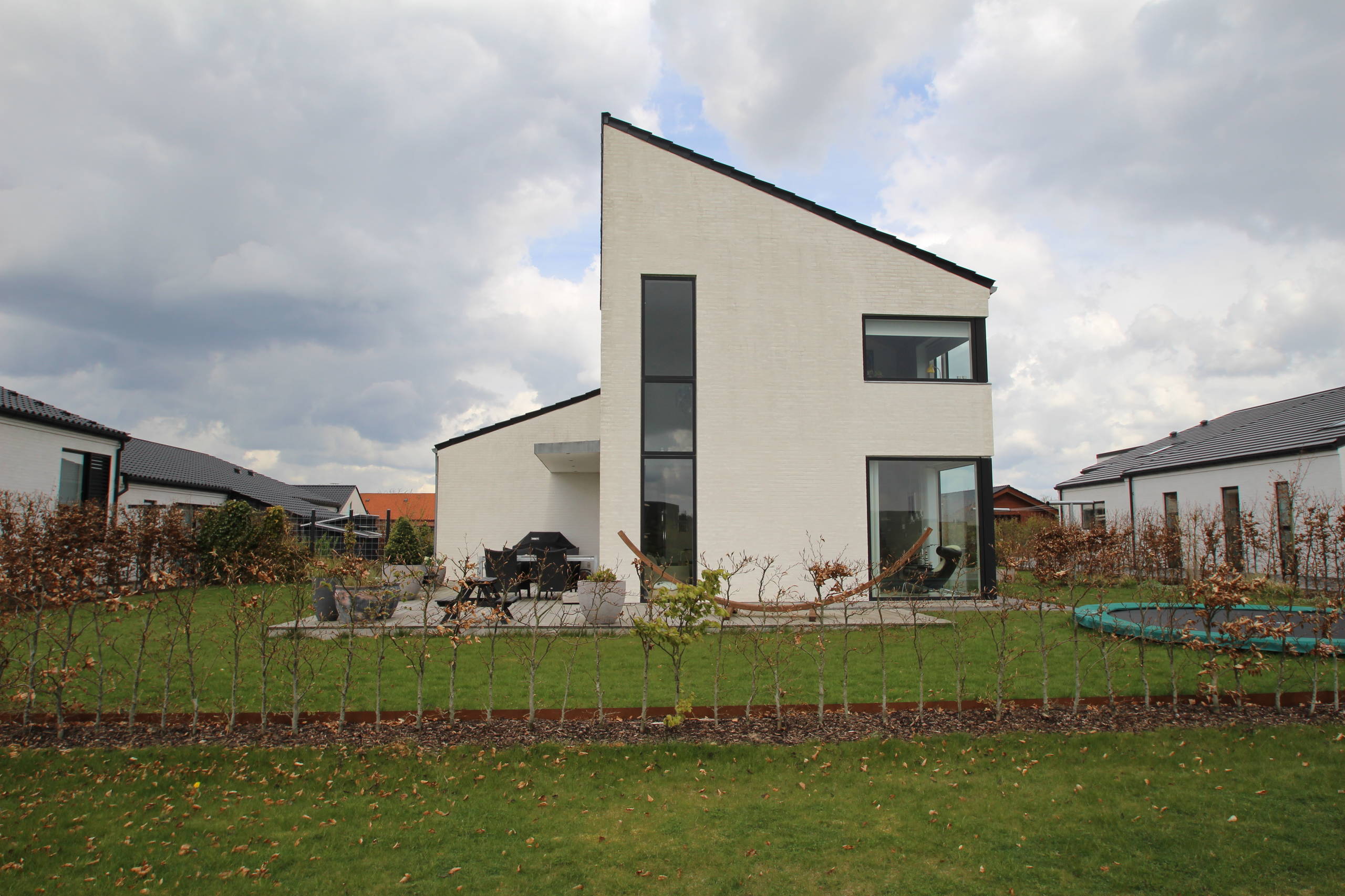 Mange nybyggede huse har tre strimler have plus et mere rummeligt areal. Du kan sagtens plante træer på ‘strimlerne’. Regn med en kronediameter på 3 meter for store frugttræer, der stammes op, så der er passage under træet. Her bliver også plads til havemøbler, eller du kan hænge en gynge i træets grene efter nogle år.