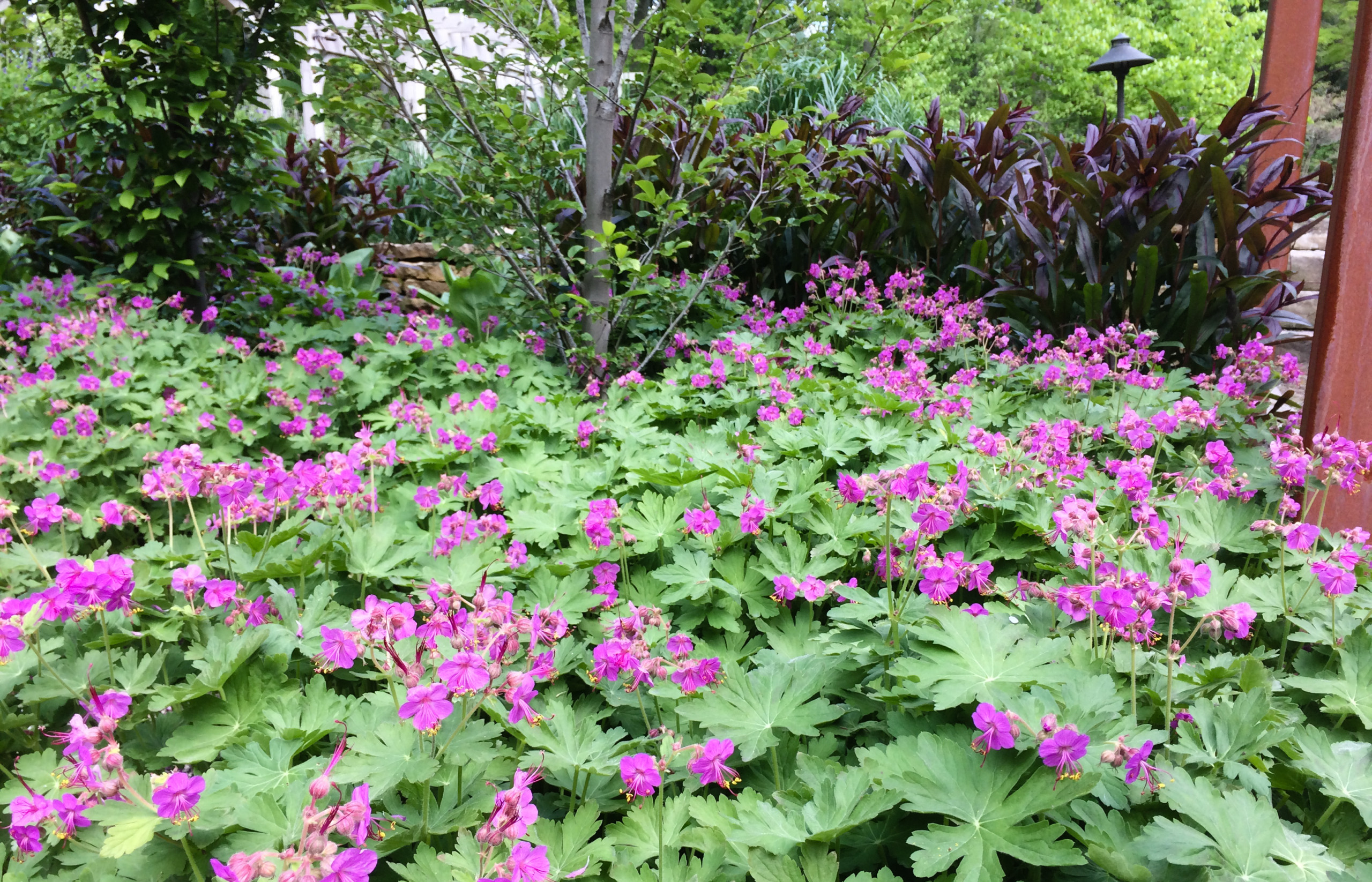 Vil du have et blomstrende bunddække i et bed med forskellige buske, så er Storrodet storkenæb, Geranium macrorrhizum, er godt bud. Den trives fint i halvskygge og får sart lyserøde eller pink blomster - alt efter hvilken sort, du vælger. Sorten ’Spessart’ er mere diskret med næsten hvide blomster. Efterårsfarverne er også flotte.