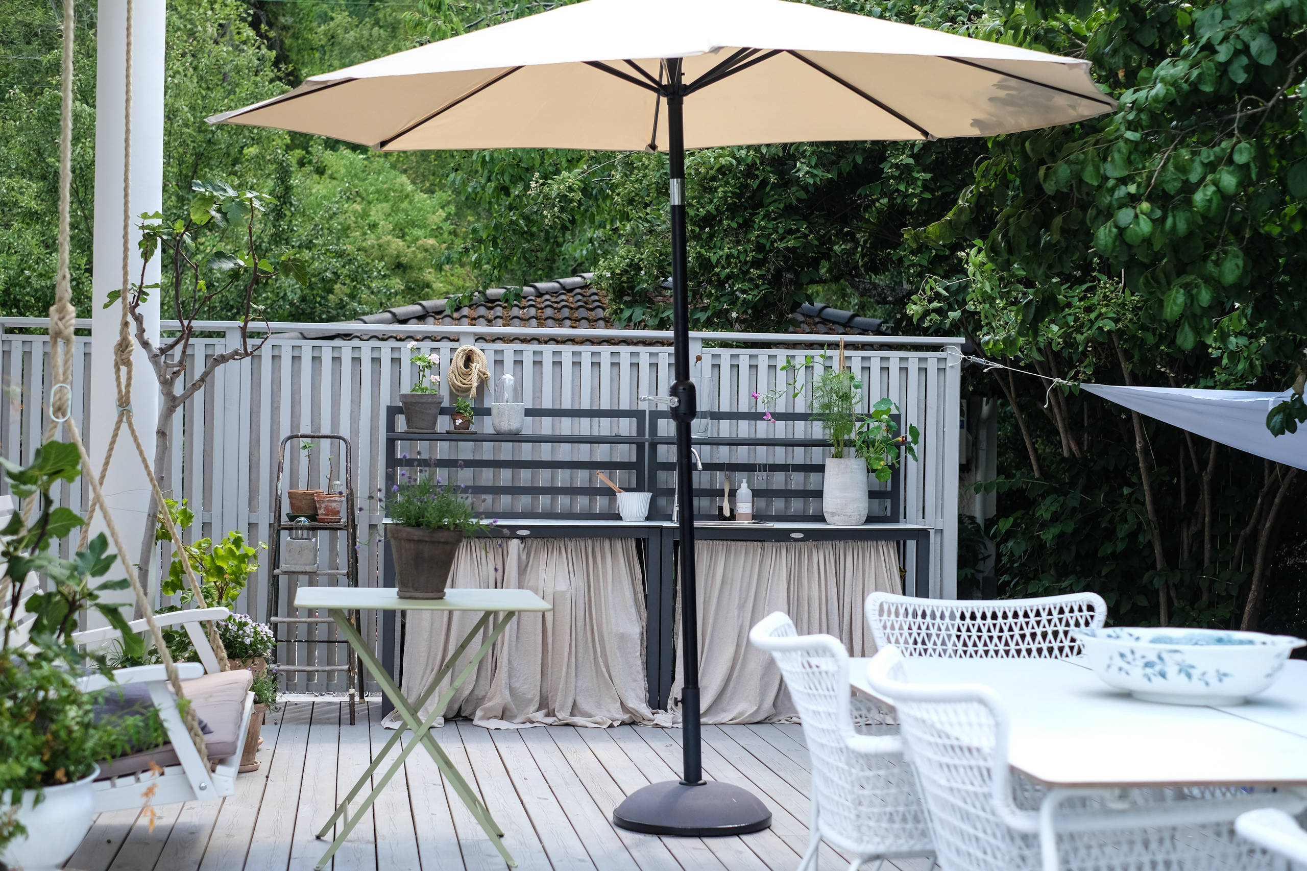 På den åbne veranda bag på huset er der et udekøkken fra Hillerstorp. Gardinet under det er nemt at tage af og vaske.
