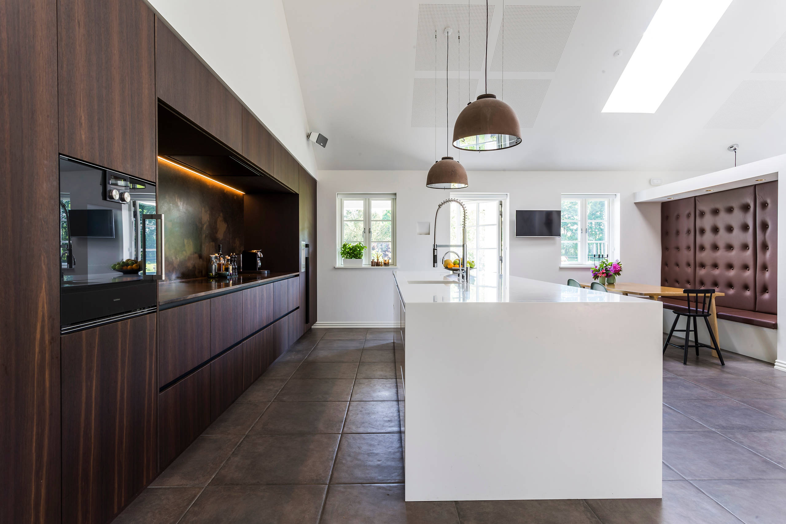 Med en diameter på 46 centimeter er de gamle gadelamper relativt store, og derfor egner de sig godt som spisebordslamper. Men har man højt til loftet og en køkkenø som på billedet her, er det oplagt at lade køkkenet oplyse af de rustikke lamper.
