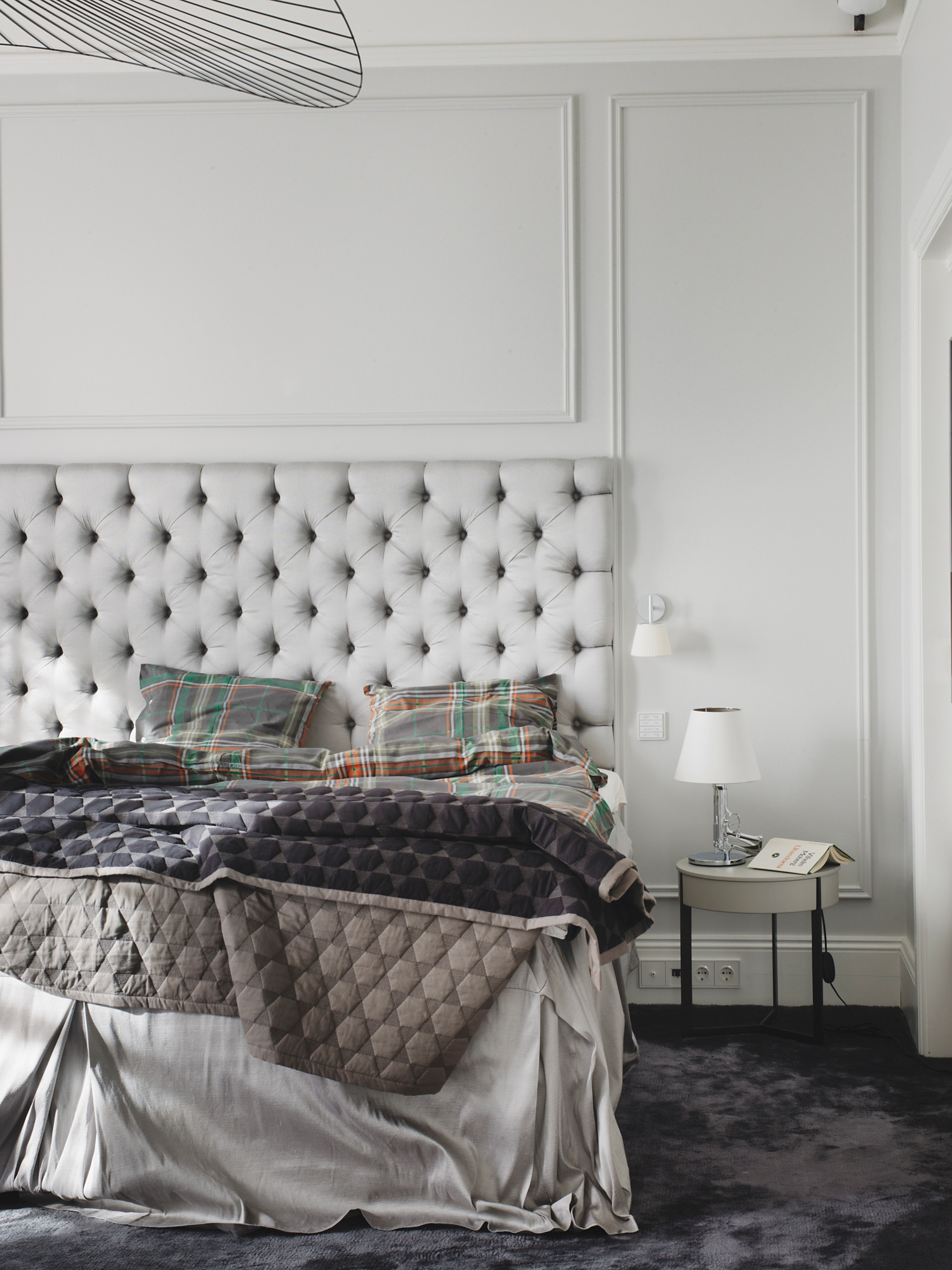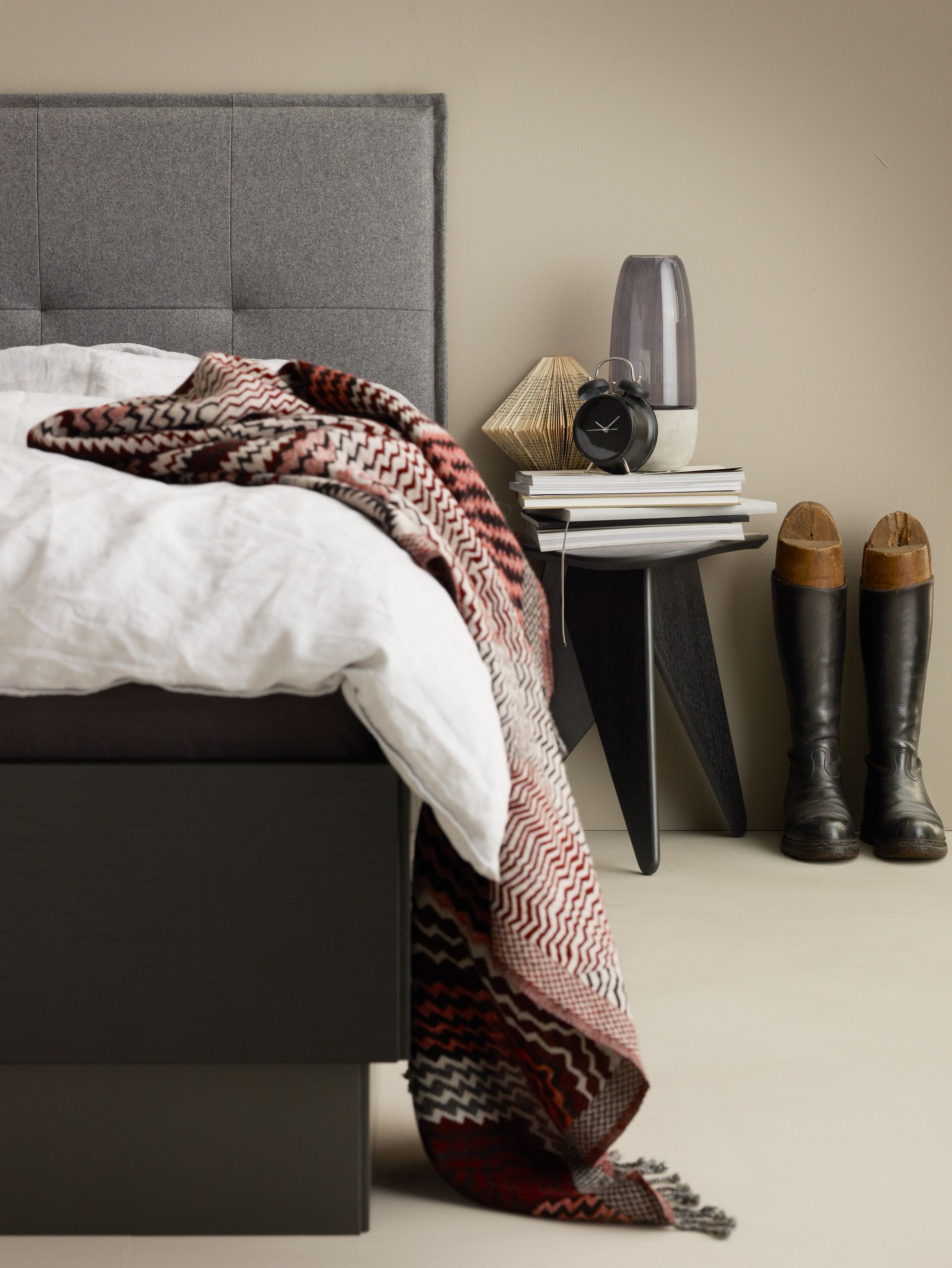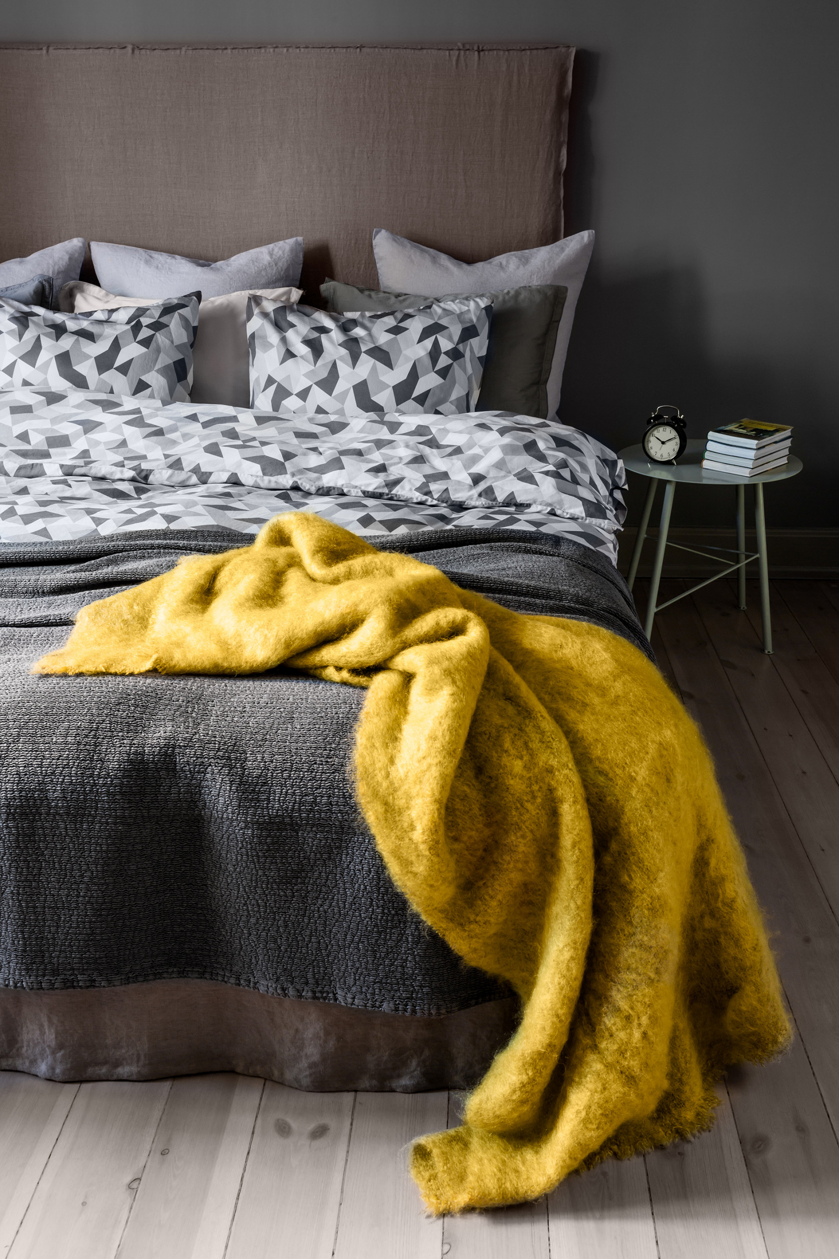 Her på billedet har indretningsarkitekten Myrica Bergqvist stylet en seng med Hays tæppe, Polygon. De to sider på sengetæppet har forskellige nuancer af grå. På indersiden er tæppet lysegråt og på ydersiden er det mørkegråt, som matcher farven på gulvtæppet. Den lyse side matcher til gengæld lagenet og hovedgærdet. Det kan være en god løsning, hvis du er bange for at blive træt af én enkelt farve – så er det bare at vende tæppet en omgang.