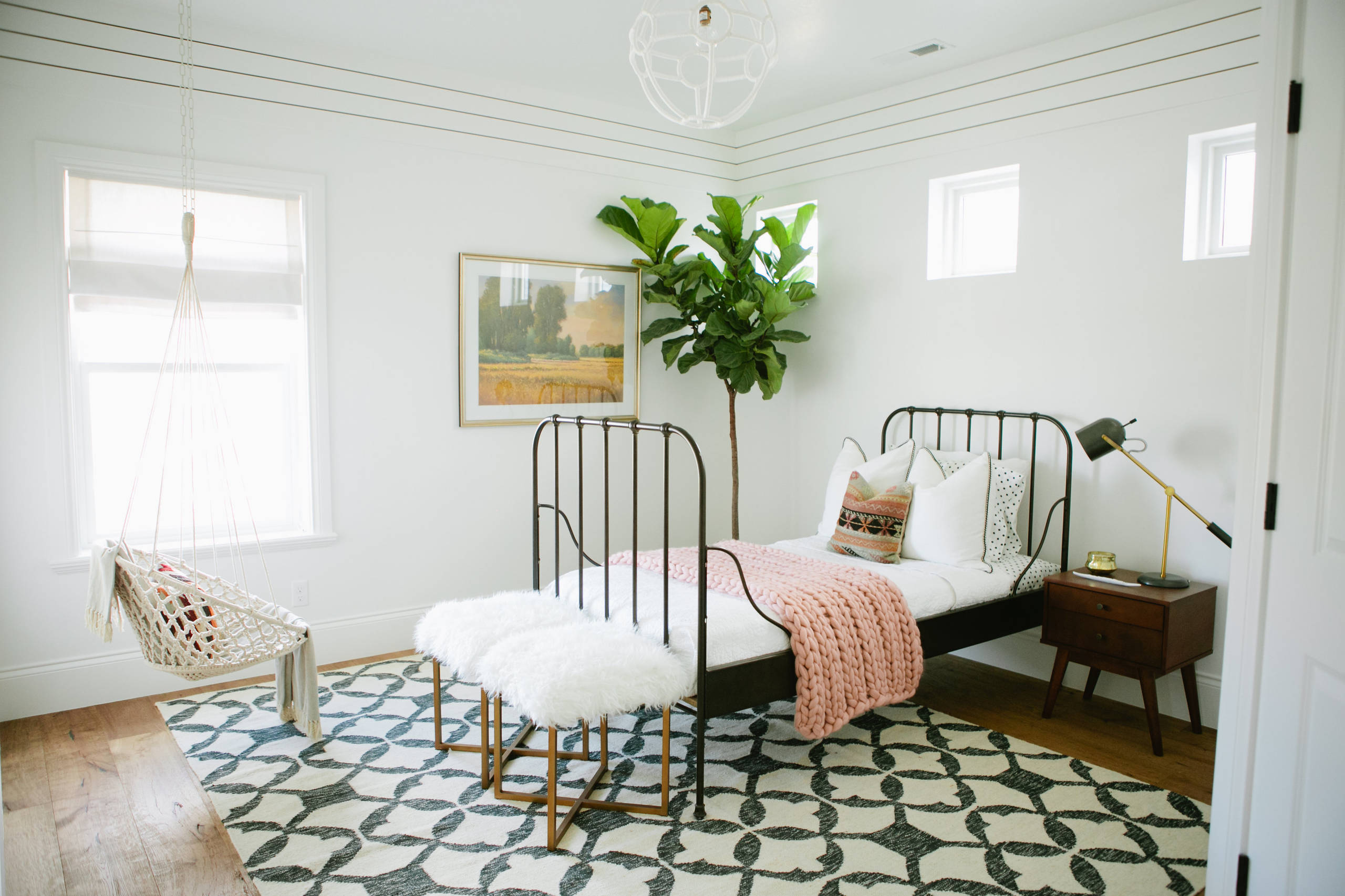 Faktisk kan det være svært at indrette soveværelset. På den ene side vil vi gerne have ro og fred, når vi skal sove, men om morgenen elsker vi at vågne til et frisk og måske lidt kækt udtryk. Et godt kompromis kan være at holde basen mørk og monokrom og så ellers tilføje en livlig accentfarve, ligesom de har gjort med dette sennep-farvet tæppe i 100 % mohairuld.