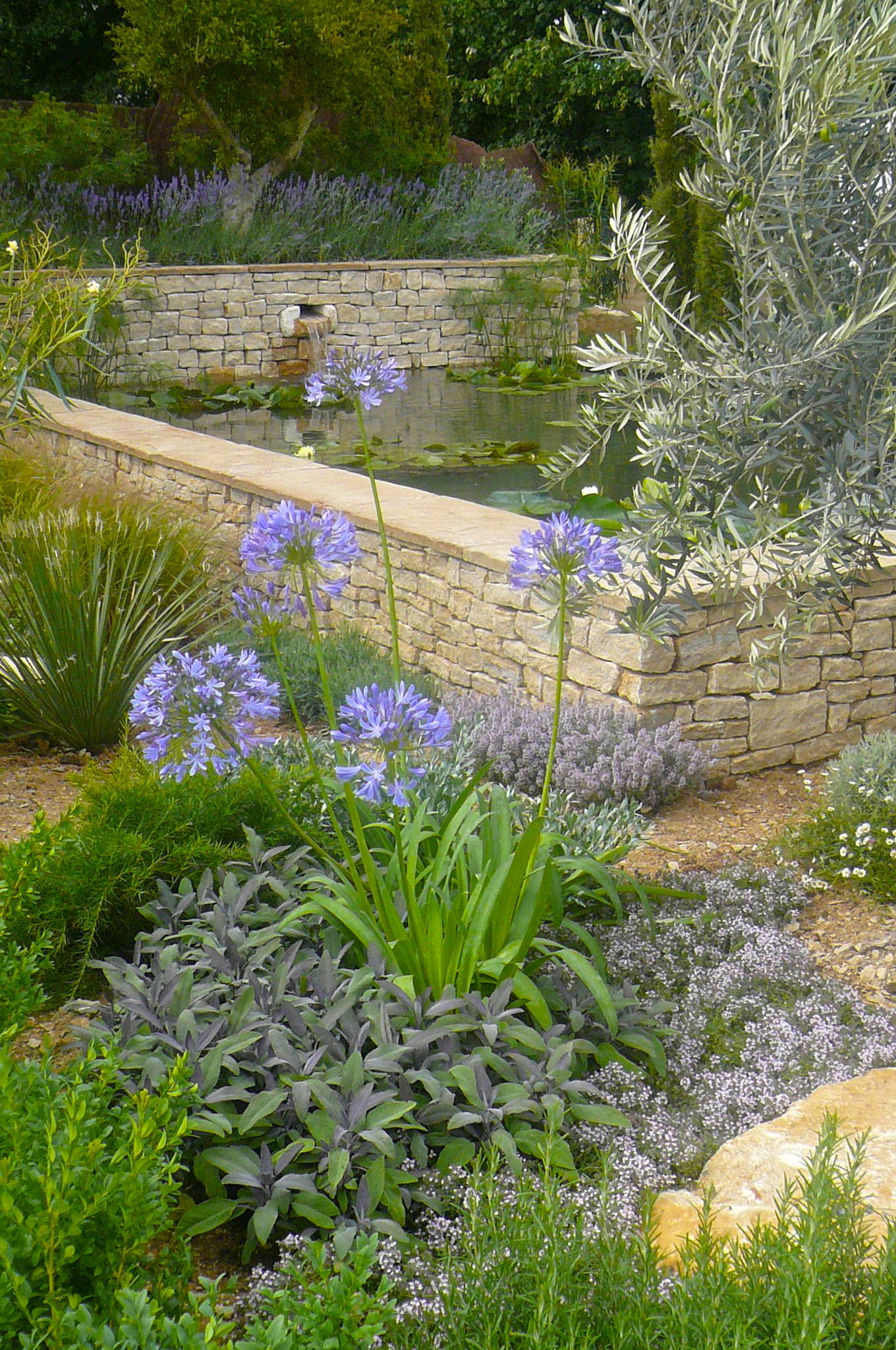 Du kan placere et par store sten hist og her for et naturligt udtryk, og så kan du ellers kaste om dig med små variationer af alpine eller lavtblomstrende stauder som Erigeron og Helianthemum. Planterne vil hurtigt finde sig til rette og sprede sig over dine sten og skråninger. En stentrappe op gennem planteuniverset vil gøre underværker, og et par træer og buske, nogle forskellige rosesorter og et par græsarter som den høje Stipa gigantea vil virkelig understrege middelhavstemaet.