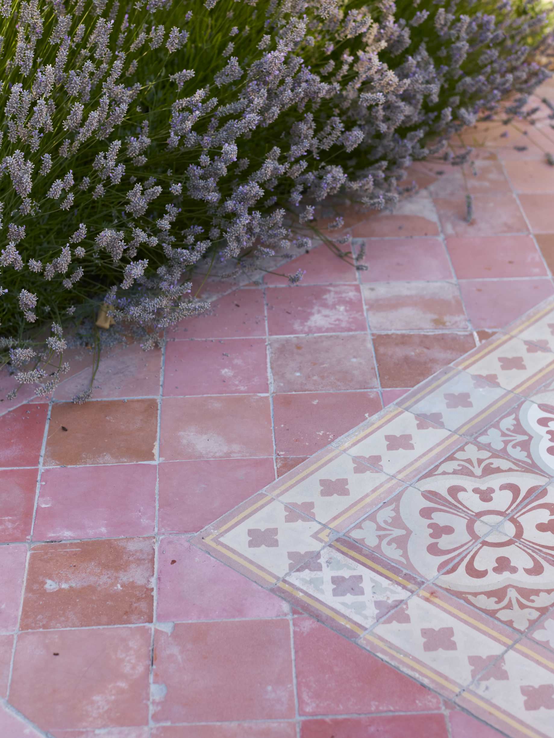 Hvis du er til det rustikke udtryk, kan du vælge terracotta-fliser med tromlede kanter, og hvis du er mere til det rene look, kan du lægge fliser, der former et mønster, som her hvor midten er belagt med et “udendørs tæppe”. At anlægge terracotta-fliserne i et diamantmønster understøtter i øvrigt den autentiske undertone. Top dit flotte gulv med potter, rustikke møbler og en væg-fontæne eller et boblende springvand samt velduftende planter.