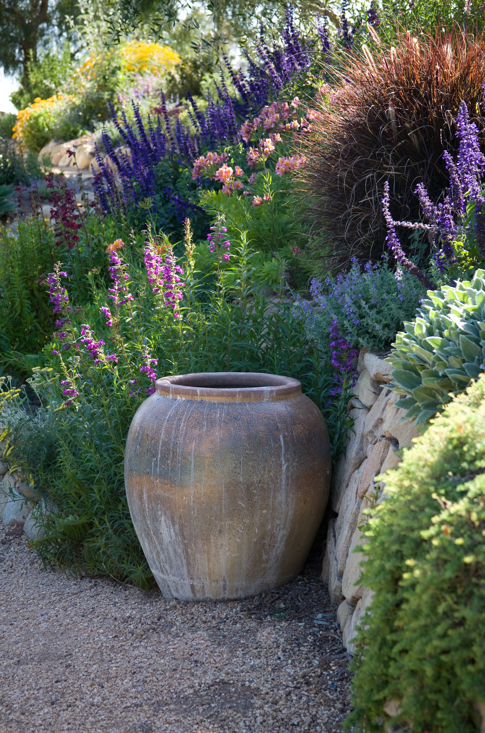 Noget, der især karakteriserer middelhavsområdet, er store mængder af de samme planter. Man kan støde på store områder med bomuldslavendel eller fransk lavendel, og når de blomstrer, former de sig som flotte høje. Imellem højene kan du plante løg som allium, der giver både højde og variation.