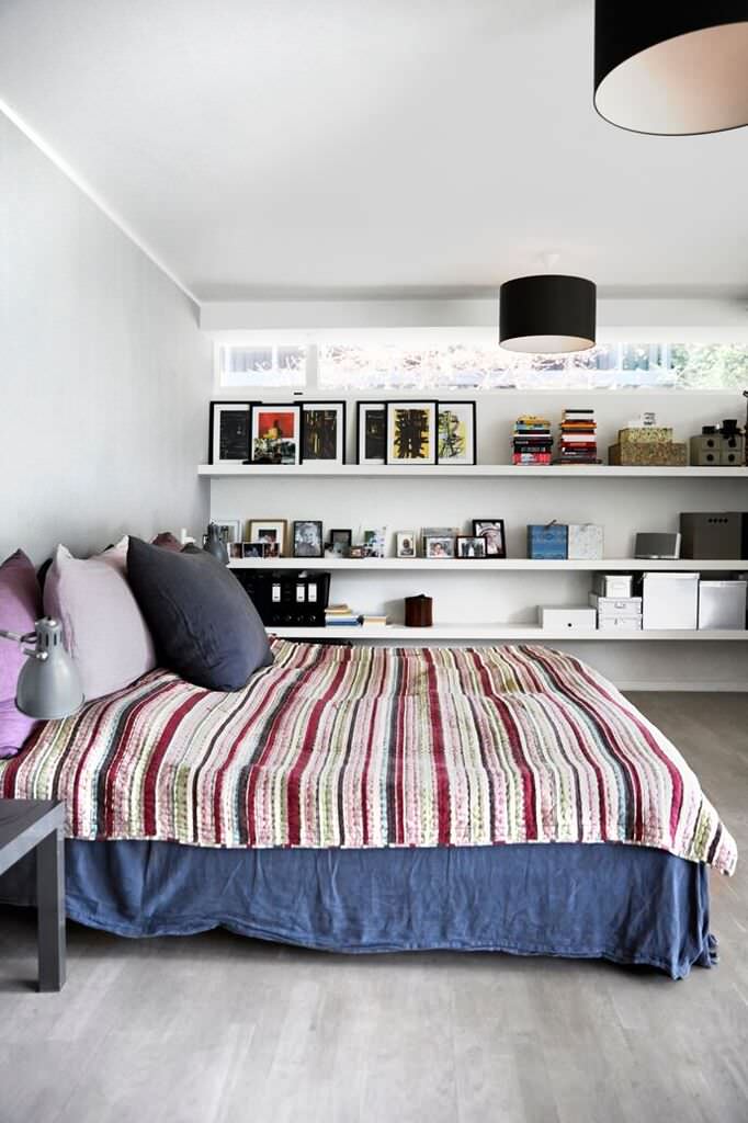 Udover at bruge farver til at snyde øjet med, kan du også bruge diverse former for hylder. Se for eksempel, hvordan man her har udnyttet den ene langside i soveværelset til tre lange hylder, der fylder hele væggen i længden. Ved at kopiere den idé vil du få følelsen af, at dit soveværelse bliver “strukket ud”. Leg med boligtilbehøret, hvor du med løsningen her kan få plads til både natlampen, dit yndlingsbillede eller flere, iøjefaldende planter helt uden problemer!