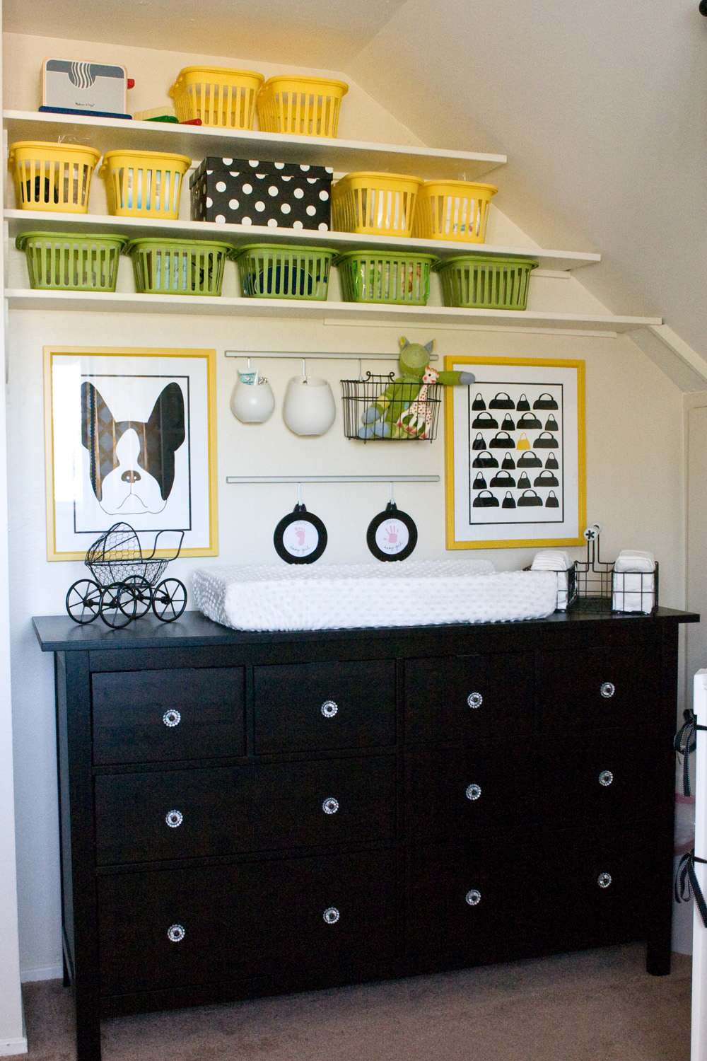 Et puslebord er mest af alt en arbejdsstation, og det er fyldt med praktiske genstande, der ikke just er kønne. Og kan du slet ikke holde ud at se på det, jamen, hvorfor så ikke lave en løsning, hvor du kan lukke af for puslebordet med en låge? Lav eventuelt puslebordet i et skab. Du kan også sætte det i et hulrum i værelset, så det er gemt lidt af vejen og ikke tiltrækker opmærksomhed.