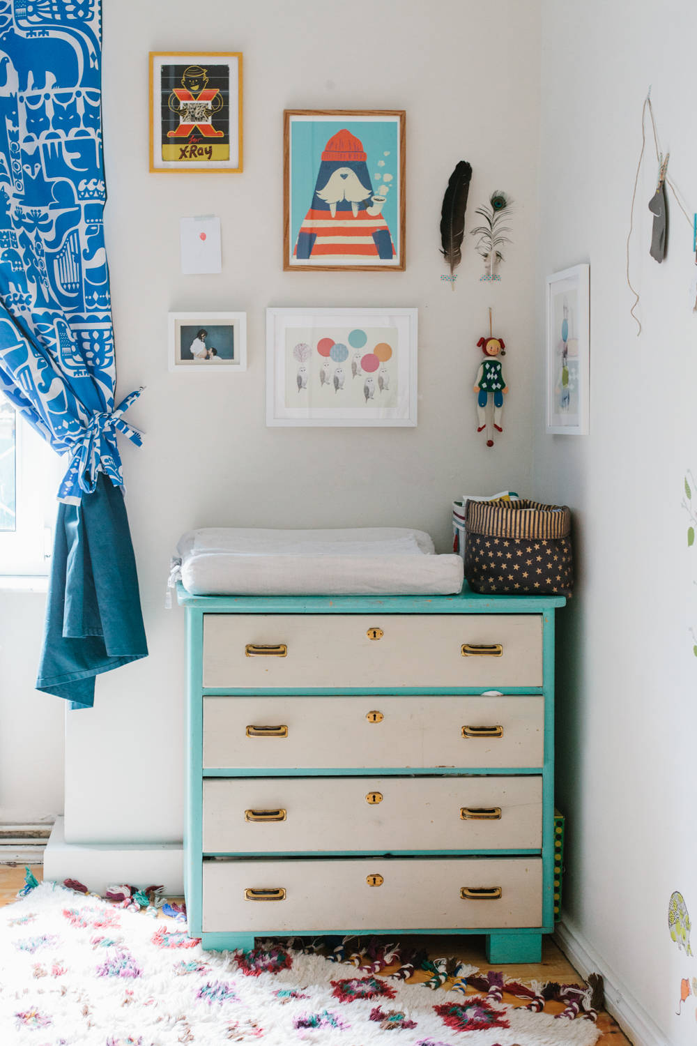 Mange vælger at bruge en gammel kommode som puslebord, og det kan også være en meget personlig og fin måde at gøre det på - men husk dog, at sikkerheden måske ikke er helt i top her, og sæt eventuelt selv kanter på kommodens topplade.