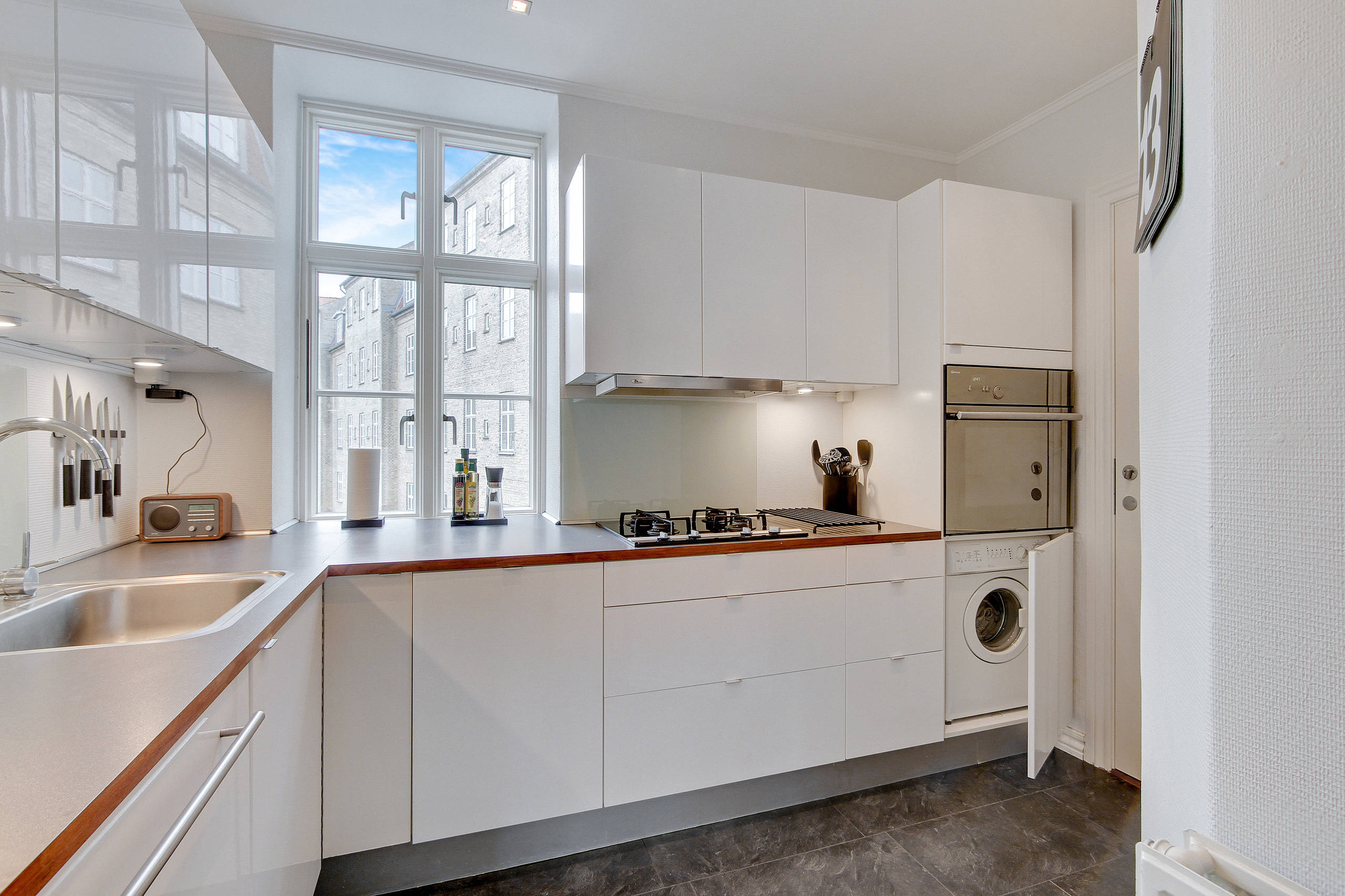 … Men når først de hvide låger skydes til side, åbnes der til en fuldt udstyret vaskecentral, der ligeså nemt kan gemmes af vejen igen, når lågen rulles for.