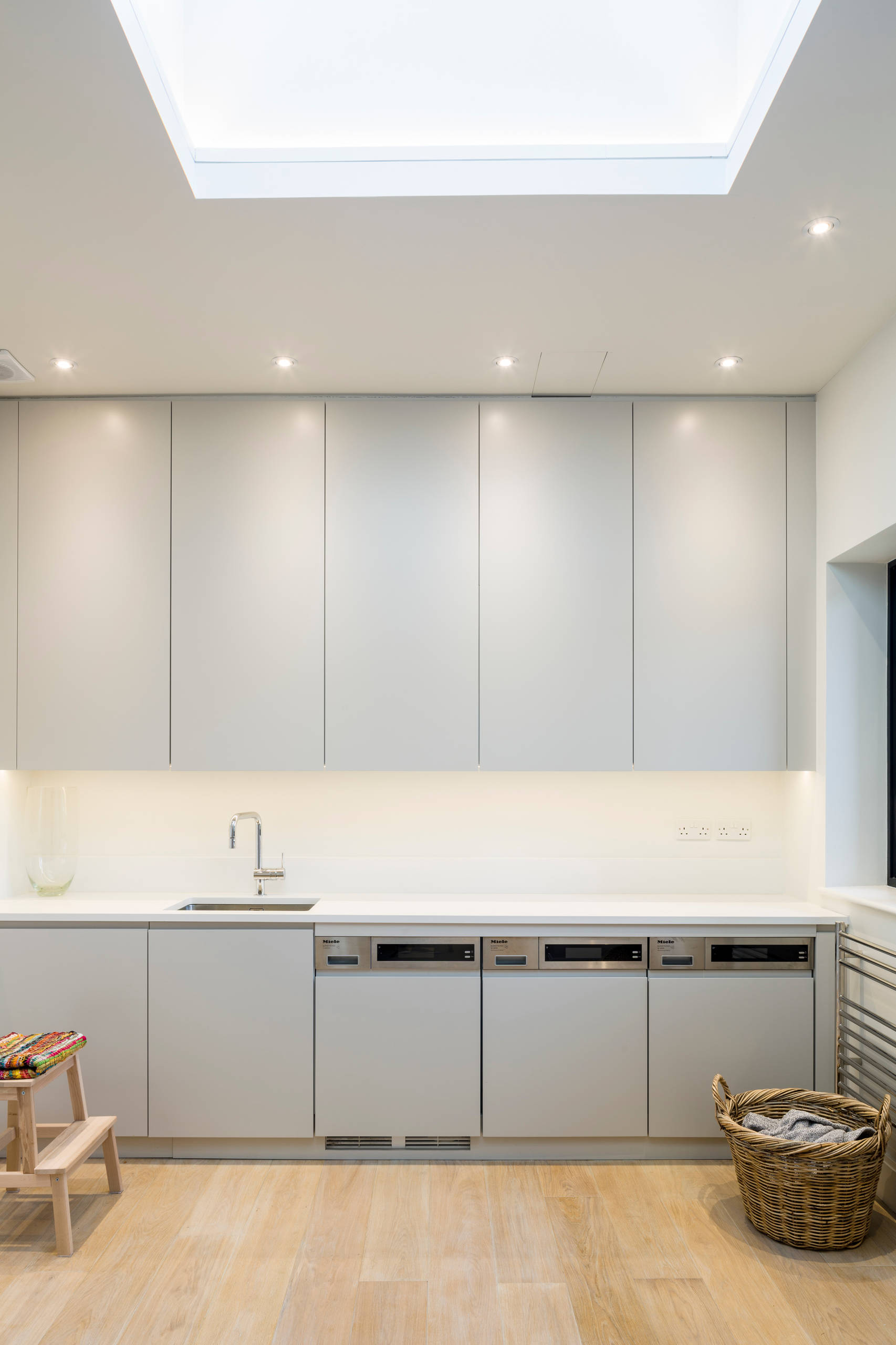 Alternativt kan du lade maskinernes kontrolpaneler komme til syne, og blot gemme resten af vaskemaskine, tørretumbler og opvaskemaskine bag neutrale låger, som på billedet her, der er fra en bolig i London.