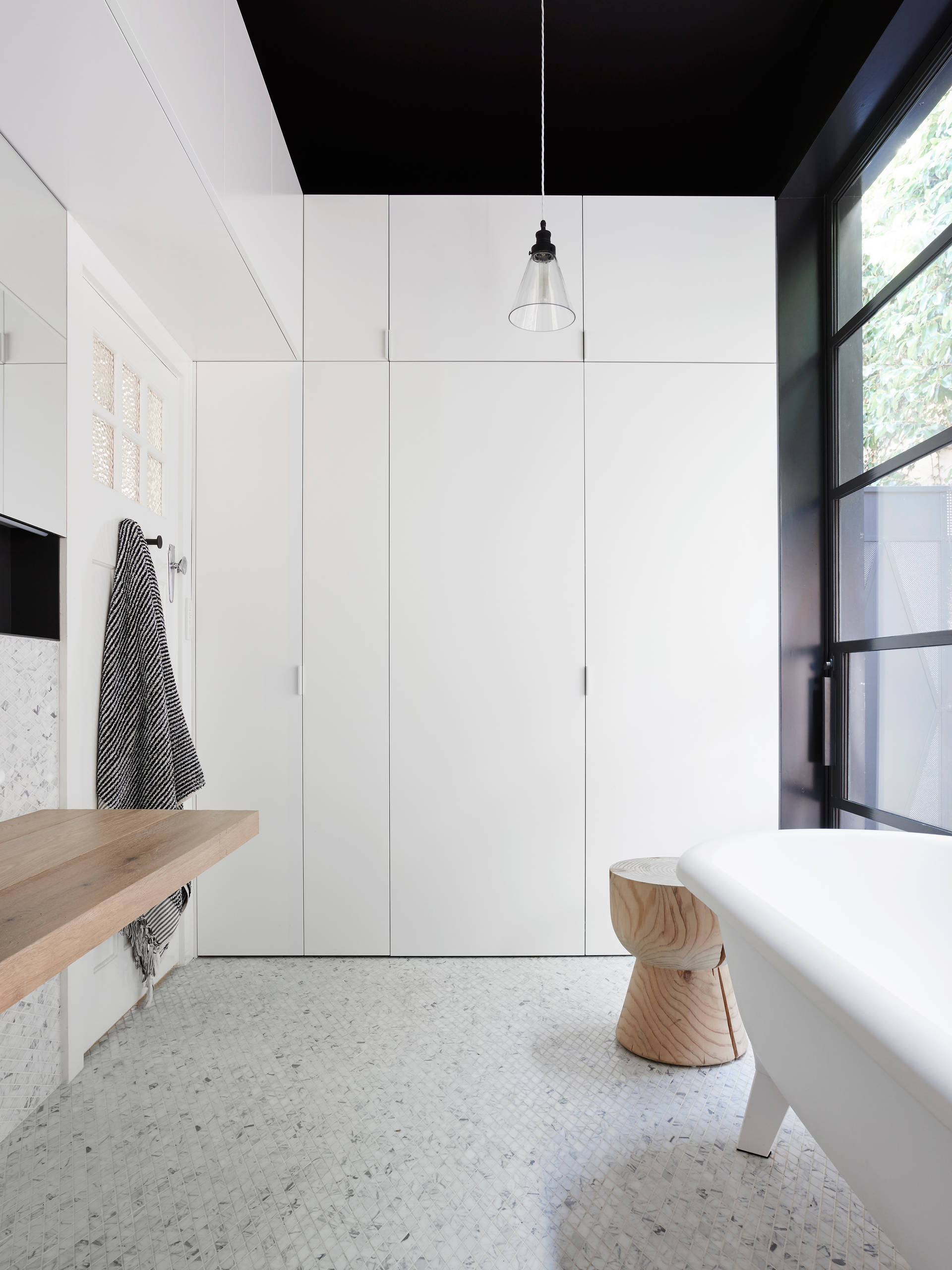 Lad dig inspirere af badeværelset i dette australske hjem, hvor ejerne flot og fikst har skjult alle de praktiske og mindre kønne maskiner og redskaber bag et par store praktiske foldelåger.