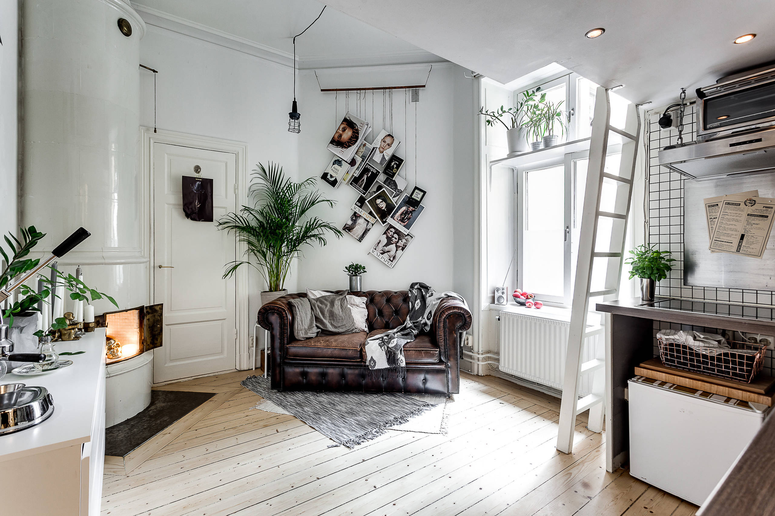 Som studerende har du næppe råd til at investere i unika print og store malerier og kunstværker. Men ofte er det langt fra sådanne ting, der skaber en personlig stil. Prøv at give dig i kast med dine egne værker - og her behøver du ikke være den store maler eller billedhugger. I denne stue har man skabt et hyggeligt sofahjørne, hvor dekorationen består af flotte magasiner, der hænger fra en stang i loftet. Sværere behøver det ikke at være!