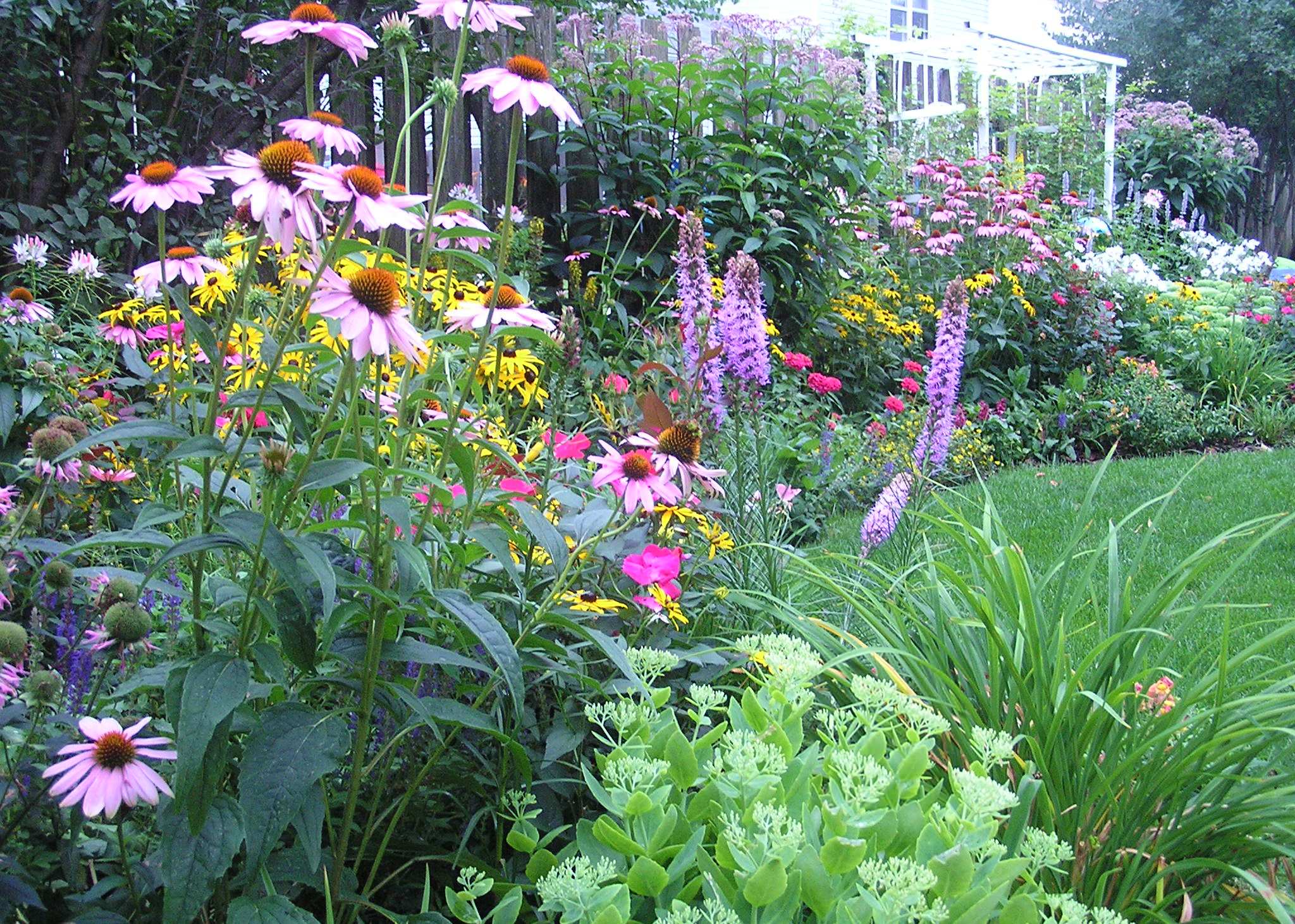 ”Ellers risikerer du at blive spontant fristet og komme hjem med en vrimmel af vidt forskellige vækster. Køb flere eksemplarer af hver plante –måske skal der 10-20 planter til, før det ser ud af noget”.